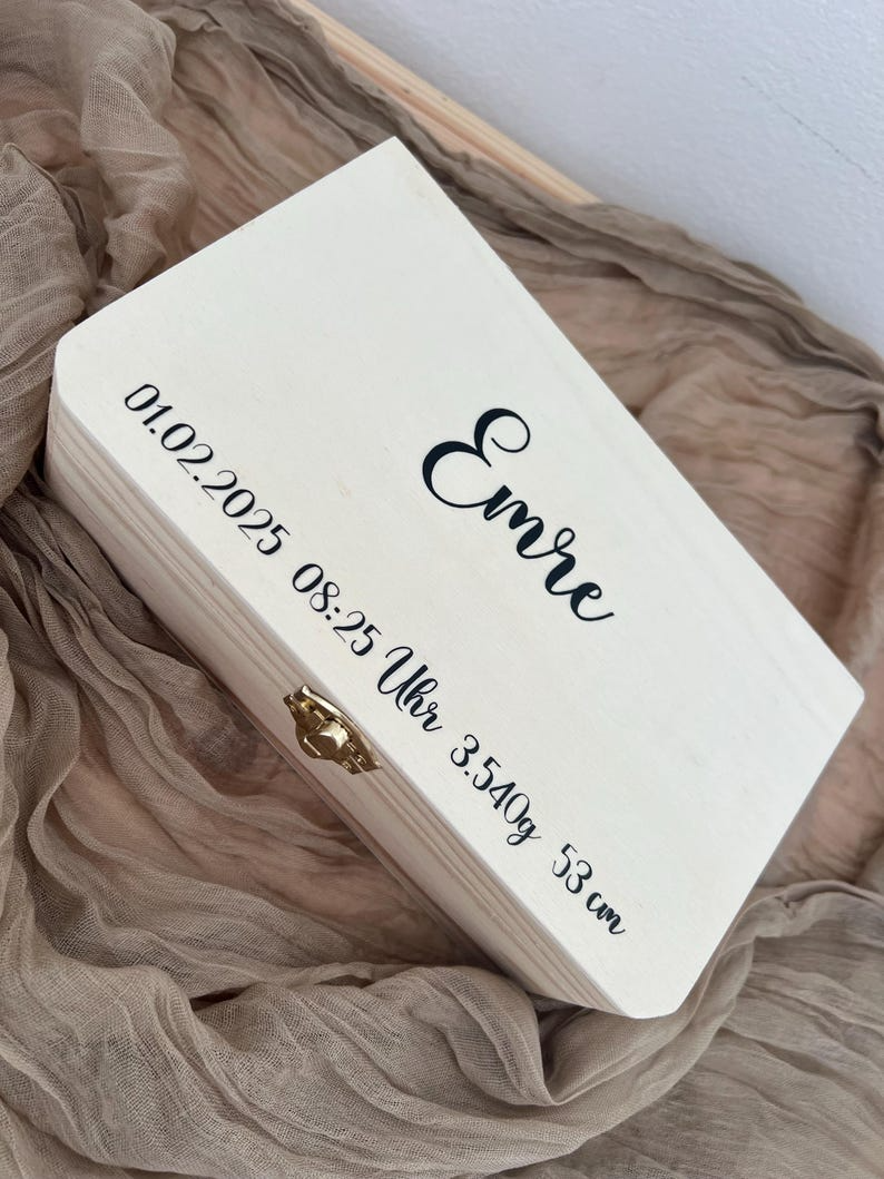 Das Besondere an der Baby-Erinnerungsbox ist die Möglichkeit, sie mit kindspezifischen Informationen zu personalisieren. Neben dem Namen des Kindes können verschiedene Geburtsdaten wie Datum, Uhrzeit, Gewicht und Größe hinzugefügt werden.